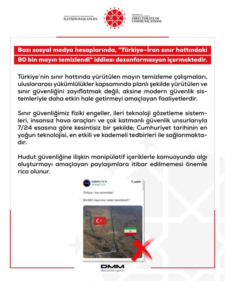 Dezenformasyonla Mücadele Merkezi, bazı sosyal medya hesaplarında yer alan “Türkiye–İran sınır hattındaki 80 bin mayın temizlendi” iddiasının gerçeği yansıtmadığını açıkladı. Açıklamada, mayın temizleme faaliyetlerinin sınır güvenliğini zayıflatmadığı, aksine modern sistemlerle daha etkin hale getirmeyi amaçladığı vurgulandı.